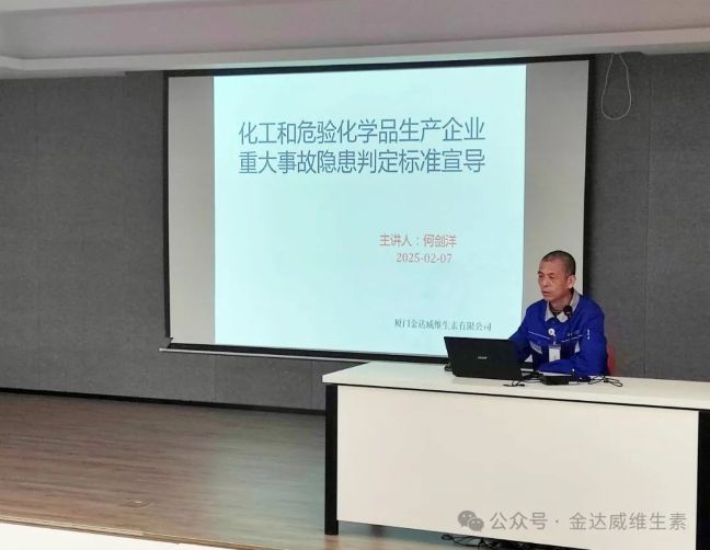 金達(dá)威維生素總經(jīng)理何劍洋首先對化工和危險化學(xué)品生產(chǎn)企業(yè)重大事故隱患判定標(biāo)準(zhǔn)進(jìn)行了宣導(dǎo),使參加人員認(rèn)識到重大事故隱患判定標(biāo)準(zhǔn)的重要意義,切實增強學(xué)習(xí)運用的主動性、自覺性,以更加強烈的責(zé)任感排查整治重大事故隱患,堅決防范遏制重特大事故。