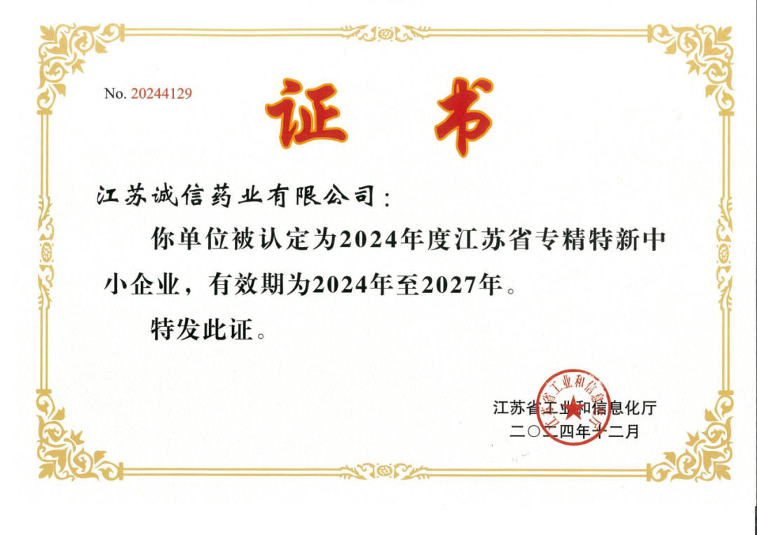 熱烈祝賀江蘇誠信藥業(yè)有限公司憑借專業(yè)化、精細(xì)化、特色化、新穎化的卓越表現(xiàn),被認(rèn)定為2024年度“江蘇省專精特新中小企業(yè)”!這一殊榮不僅是對企業(yè)創(chuàng)新實力與核心競爭力的高度認(rèn)可,更彰顯了誠信藥業(yè)在醫(yī)藥健康領(lǐng)域的標(biāo)桿地位!