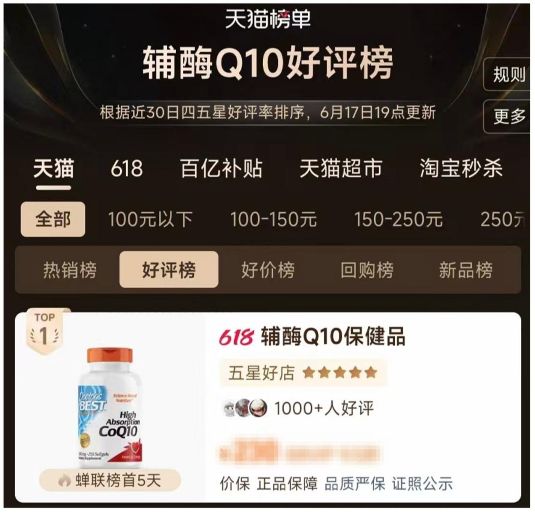 輔酶Q10:品類賽道“常勝將軍”,穩(wěn)坐天貓全周期TOP1
