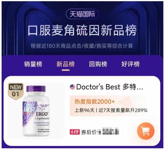 上市即售罄的Doctor's Best多特倍斯五合一光紫瓶,是Doctor's Best多特倍斯以科技實(shí)力不斷突破細(xì)胞級(jí)重塑年輕的又一力作。以麥角硫因?yàn)橹鳎瑫r(shí)添加專利PQQ、R-硫辛酸、煙酰胺、膠原蛋白肽,精準(zhǔn)瞄定女性消費(fèi)者“內(nèi)源抗衰”需求,憑借“一瓶打造肌膚亮緊彈”的優(yōu)勢(shì),在618大促期間供不應(yīng)求爆賣(mài)售罄,榮登天貓口服麥角硫因新品榜TOP1。